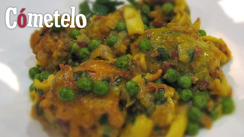 Para los calamaritos en salsa se necesitan 500 g. de calamaritos, 100 g. de jamón ibérico, un puerro, dos dientes de ajo, 150 g. de guisantes, harina, medio vaso de vino blanco, un vaso de caldo de pescado, azafrán, perejil, aceite de oliva virgen extra, sal y pimienta. Para los brócoli en salsa de Orly se emplarán un brócoli, dos huevos, harina, levadura, aceite de oliva virgen extra, vinagre, sal y pimienta.