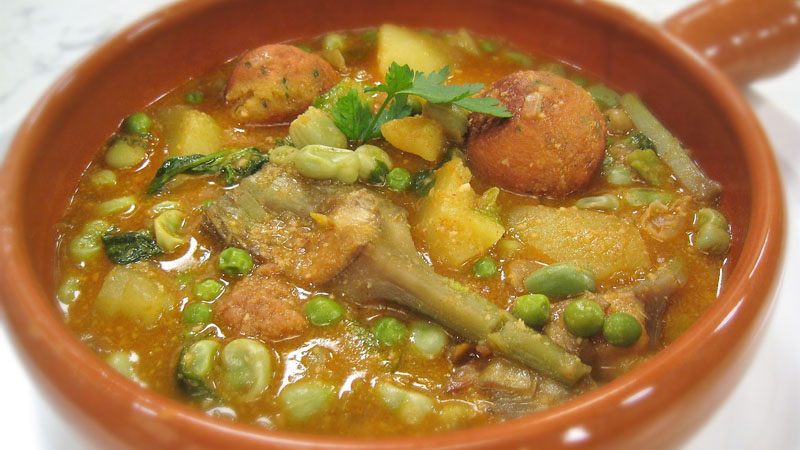 Esta cazuela de habas, guisantes, lechuga y alcachofas se completa con unas bolas hechas con pan rallado, huevos batidos, ajo y perejil muy picados que se fríen en aceite de oliva y se agregan al guiso, donde se terminan de hacer.