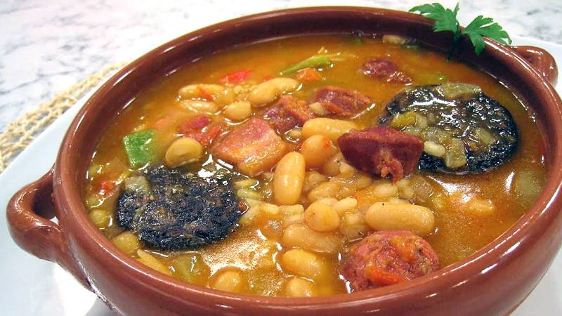 Poner las alubias en remojo la noche anterior. Picar las cebollas y comenzar a rehogar en virgen extra con los ajos laminados, una hoja de laurel, el pimiento rojo troceado y las hebras de azafrán. Añadir el puerro cortado en rodajas y la calabaza. Sofreír, agregar los tomates picados en dados y remover bien. Incorporar entonces las alubias escurridas, cubrir con agua fría, añadir un poco de sal y dejar cocer unos 40 minutos, hasta que estén tiernas.