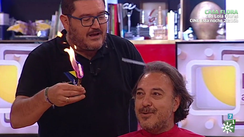 Básicamente consiste en utilizar el fuego para realizar el corte del pelo. Y aunque intentamos que Manolo Sarria participe en una demostración ante el público, lo cierto es que nuestro presentador no se muestra precisamente muy interesado en ello.