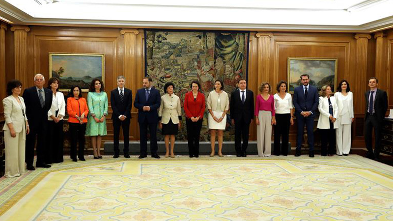 Los diecisiete ministros, once mujeres y seis hombres, que forman el Gabinete de Pedro Sánchez han prometido hoy sus cargos ante el Rey en la Zarzuela en una ceremonia sin símbolos religiosos, con una fórmula novedosa que subraya la presencia femenina-