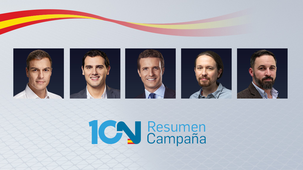 Pedro Sánchez ha intervenido en en Madrid y a esta hora en Barcelona, al igual que Albert Rivera. Pablo Casado ha estado en Palencia y Madrid. Pablo Iglesias ha intervenido en dos mítines, en Toledo y Madrid y Santiago Abascal ha cerrado campaña en Madrid.