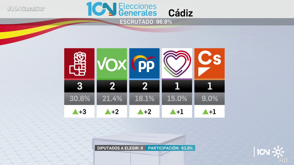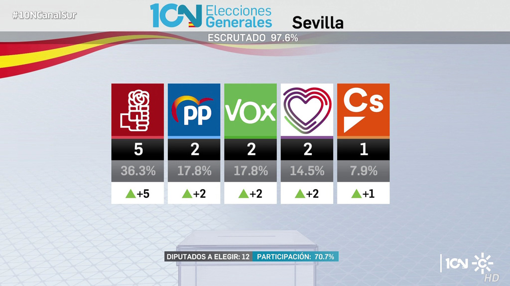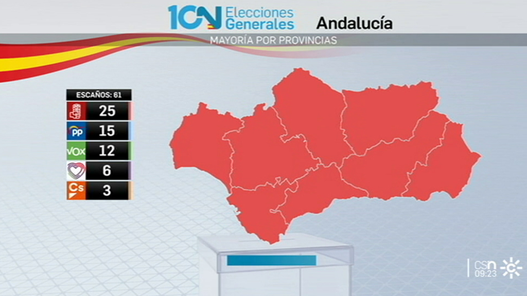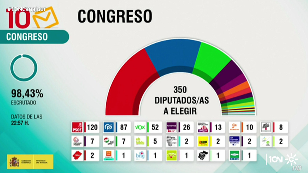 El PSOE es el ganador con 120 escaños, seguido por el PP con 88 diputados. Vox duplica sus apoyos hasta llegar a los 52 diputados y Ciudadanos se hunde.