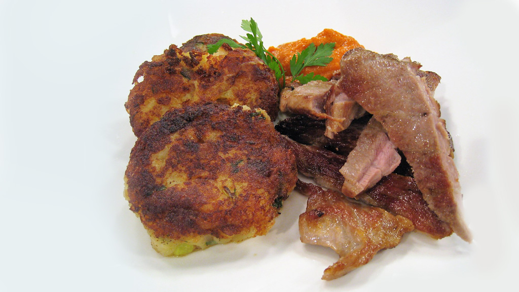 Para el mojo, disponer en una fuente de horno el tomate y el pimiento rojo. Regar con virgen extra y hornear, 35 minutos, a 175º C. Para las papas enchorizás, pelar las patatas cocidas y pasarlas por el rallador. Incorporar 1 huevo, la cebolleta y el chorizo muy picados, el queso rallado, 1 cucharada bien colmada de harina, un poco de perejil picado, sal y pimienta. Mezclar muy bien, cubrir y reservar al frío. Para terminar el mojo picón, dorar con un chorrito de aceite, 2 dientes de ajo fileteados junto con una guindilla cayena y la rebanada de pan troceada. Añadir una cucharadita de pimentón dulce, un chorrito de vinagre y media cucharadita de comino. Dejar hervir un poco y batir en una jarra junto con el tomate y el pimiento, asados y pelados, y una pizca de sal. Por otro lado, coger pequeñas porciones de masa de papas enchorizás, pasarlas por huevo batido y dorarlas en una sartén con un poco de virgen extra. Finalmente, cocinar los filetes de presa en una sartén con un poco de aceite de oliva virgen extra.