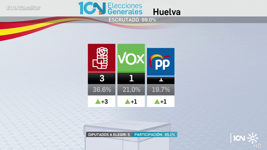 La participación en las urnas es de un 65,12%, lo que sitúa la abstención en Huelva en el 34,88%.