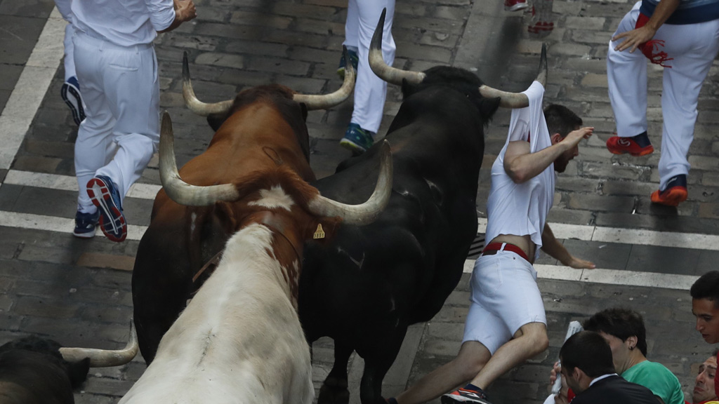 Con las campanas de la iglesia de San Cernin anunciando las ocho de la mañana, se ha prendido la mecha que ha abierto el portón de los corrales de los que han partido los astados, encabezados por los cabestros, a los que rápidamente ha rebasado un toro colorado, al que se han sumado varios de sus hermanos llegando en algunos momentos hasta situarse cuatro toros en cabeza.