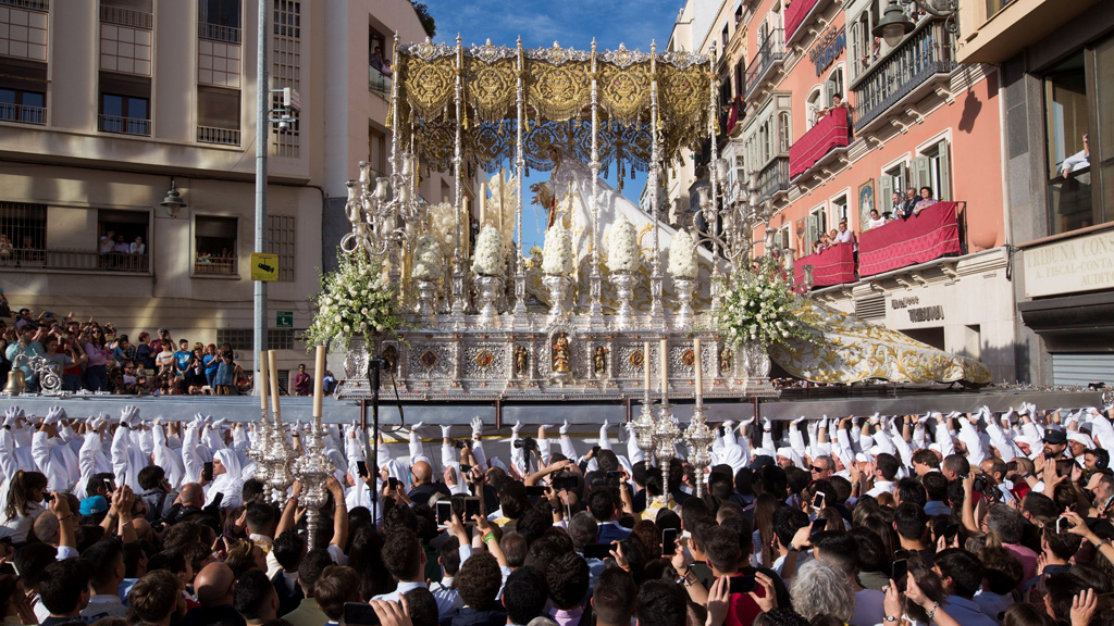 Desde Málaga se ofrecen imágenes de los dos tronos del Rocío, por Cisneros-Especería, así como de la Sentencia, de la que se ha emitido la salida completa. Y de Nueva Esperanza, a su paso por la Plaza de la Constitución.