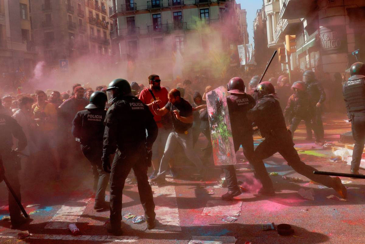 Una vez terminada la manifestación convocada por la asociación Justicia Salarial Policial (Jusapol) en los aledaños de la plaza Cataluña se han sucedido los enfrentamientos entre los Mossos y los independentistas después de que grupos de soberanistas fueran al encuentro de los policías nacionales y guardias civiles al grito de "fuera fascistas de nuestros barrios".