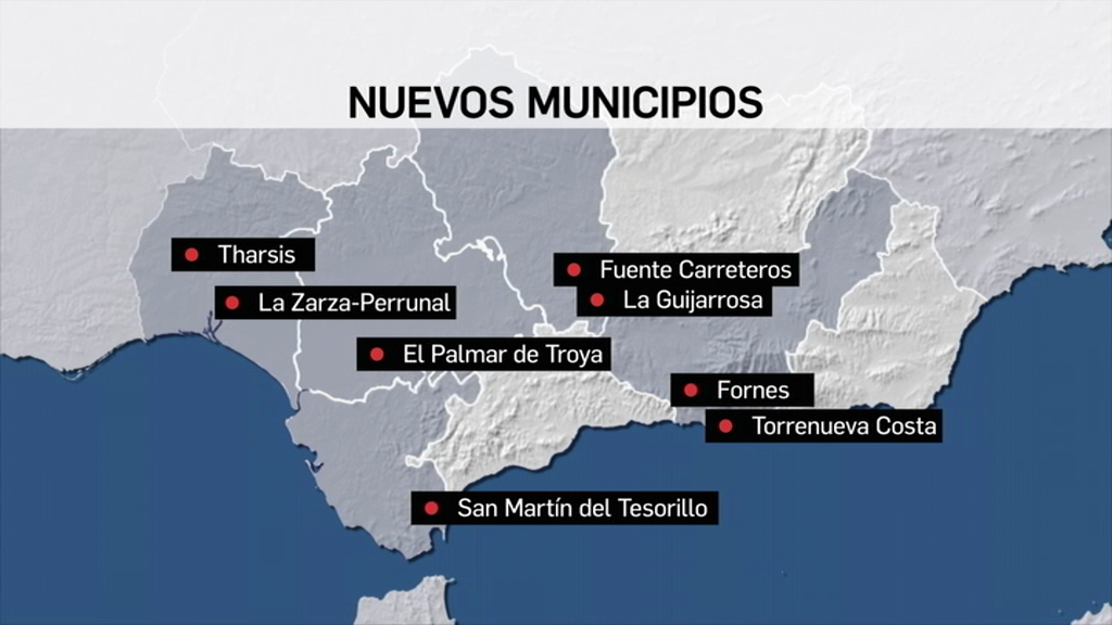 Tharsis, que se segrega de Alosno, y La Zarza-Perrunal, que lo hace de Calañas, son los nuevos municipios de Huleva. En Cádiz, será San Martín del Tesorillo el nuevo municipio que nace de Jimena de la Frontera, mientras que, en Sevilla, el Palmar de Troya adquiere entidad propia al segregarse de Utrera.