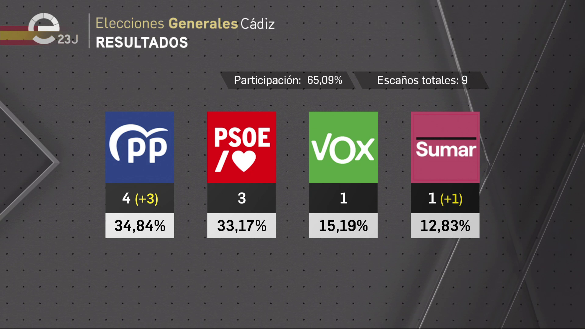 El PP ha ganado las elecciones en la provincia de Cádiz al haber conseguido cuatro diputados con el 34,74 % de los votos. Con el 96,41 % escrutado, el PSOE ha quedado a 1,47 puntos de diferencia del PP, ya que ha obtenido el 33,27 % de los sufragios y tres escaños. Además de cuatro diputados del PP y tres del PSOE, la provincia de Cádiz, en la que se dirimen nueve escaños, ha dado un diputado a Vox y otro a Sumar.