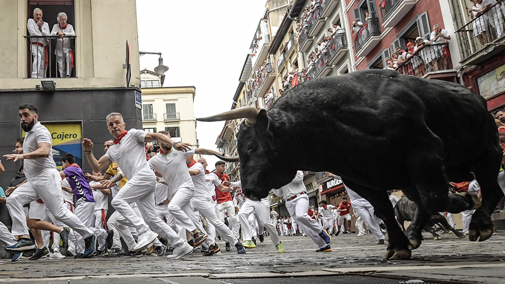 Quinto encierro de los Sanfermines de 2023, protagonizado por toros de la ganadería gaditana Núñez del Cuvillo, que han realizado una carrera rápida y limpia sin dejar heridos por asta pero sí por contusiones. De hecho, dos corredores, procedentes de Barcelona y de Estados Unidos, han sido trasladados este martes al Hospital Universitario de Navarra.