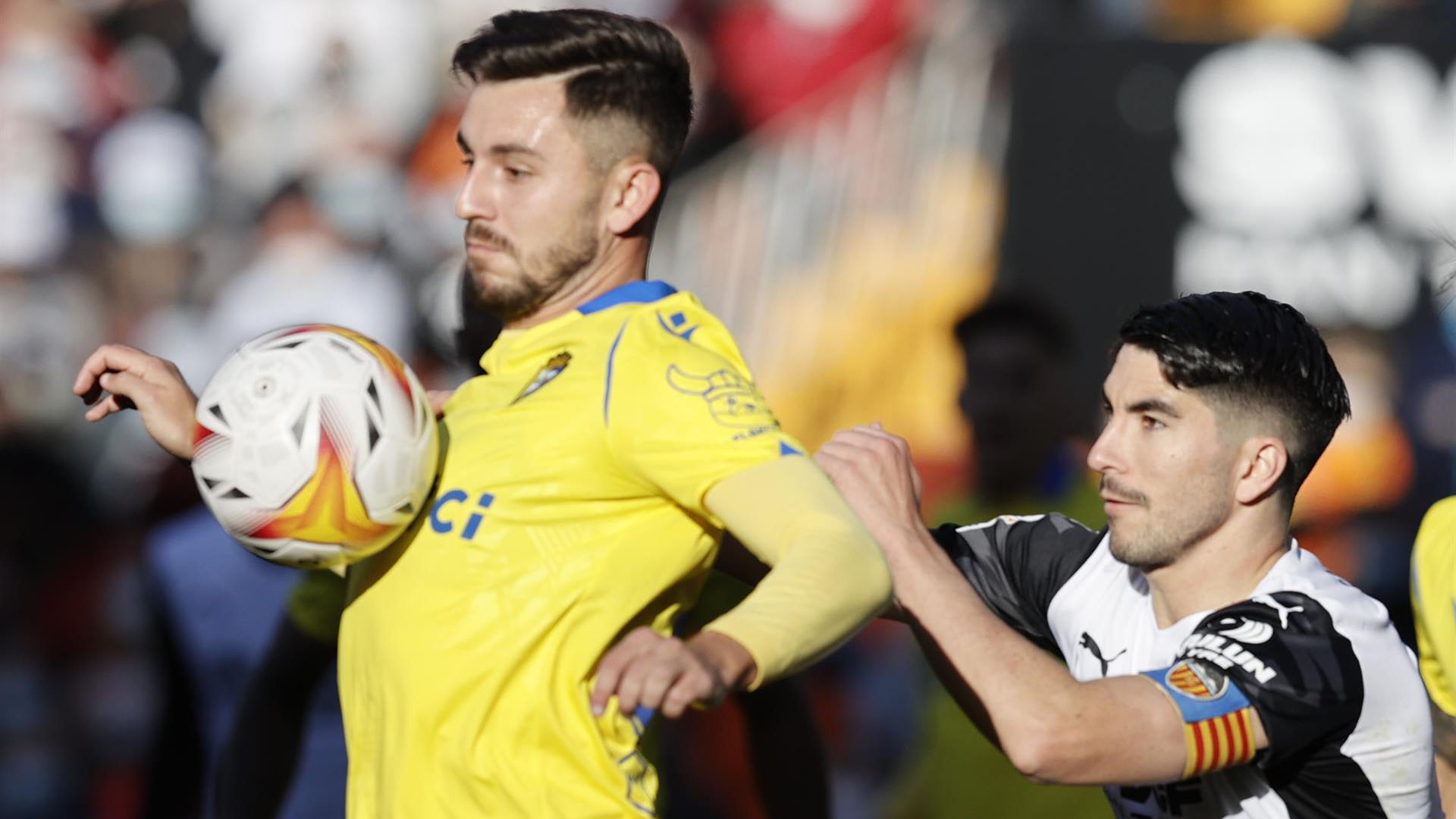 Los dos equipos, al alza en las últimas jornadas aunque con objetivos muy diferentes, desplegaron una gran intensidad en su juego, con un Valencia que cedió la iniciativa al conjunto gaditano para buscar eléctricos contragolpes con Guedes y Bryan Gil como puntas de lanza. Sin embargo, los locales se mostraron erráticos en el último pase y apenas inquietaron al meta argentino Ledesma. No sería hasta a diez minutos del final cuando el Valencia dispuso de su primera, y única, ocasión clara de partido tras un remate de cabeza del uruguayo Maxi Gómez que se estrelló en el larguero y cuyo rechace no pudo cabecear a gol Alderete ante la rápida acción defensiva de Alejo.