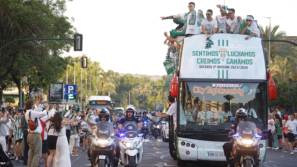 La ciudad se echa el ascenso en la calle tras la locura blanquiverde del Arcángel. Primero con ofrenda floral al custodio de Córdoba, San Rafael, y enel Ayuntamiento. Por la tarde, una rúa en autobús descapotable ha recorrido diferentes calles de la ciudad hasta llegar a las emblemáticas Tendillas.