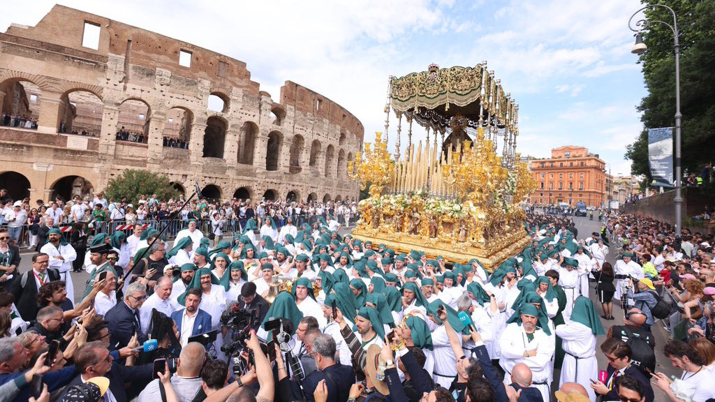 Procesión histórica protagonizada por las dos imágenes, un acontecimiento en la cuna del cristianismo que ha discurrido por lugares emblemáticos como el Coliseo o el Circo Massimo y que ha retransmitido Canal Sur. Aquí puedes volver a ver la procesión.