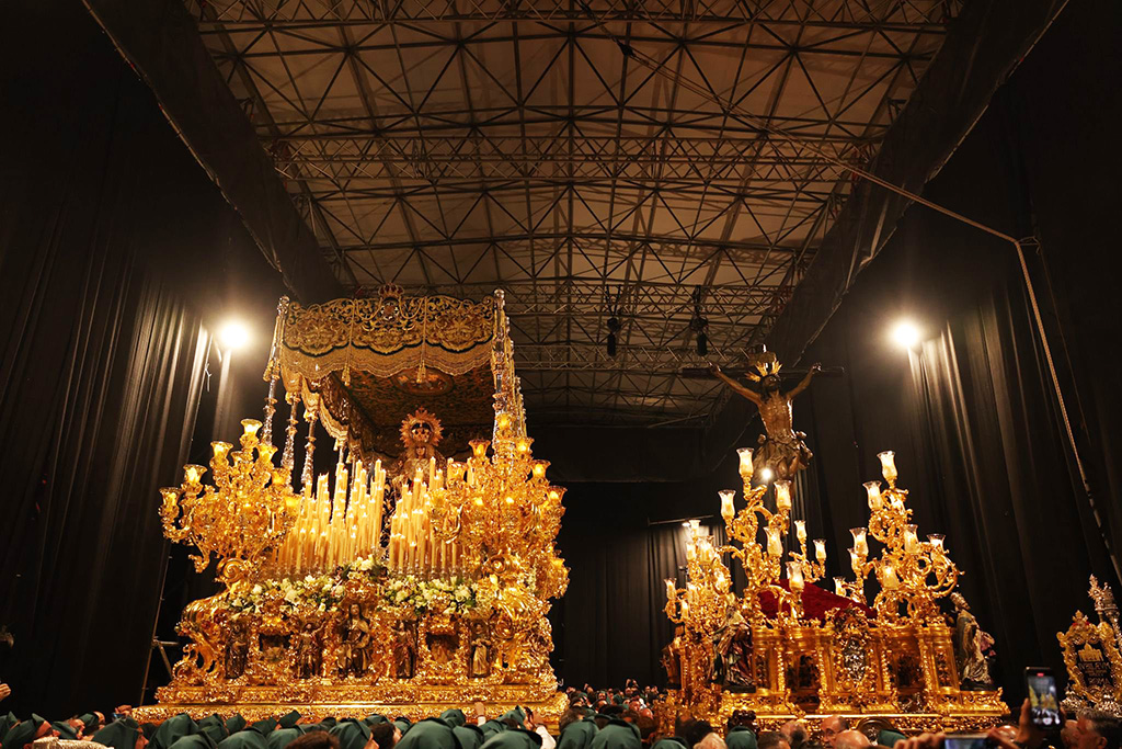 El cristo trianero ha sido revestido con potencias y corona de espinas para esta ocasión especial. En los codales de su paso procesional se han incluido detalles de las hermandades del Viernes Santo, en recuerdo a las cofradías sevillanas y, sobre todo, a aquellas que realizan estación de penitencia en la misma jornada. Otra curiosidad, en este caso en el trono de la Esperanza, titular a la que le han dedicado vivas los fieles durante su recorrido, ha sido que han colocado a los angelitos que portan romero en el lateral lazos con el color de la Archicofradía y de la corporación hispalense, como muestra de unión entre Málaga y Sevilla.