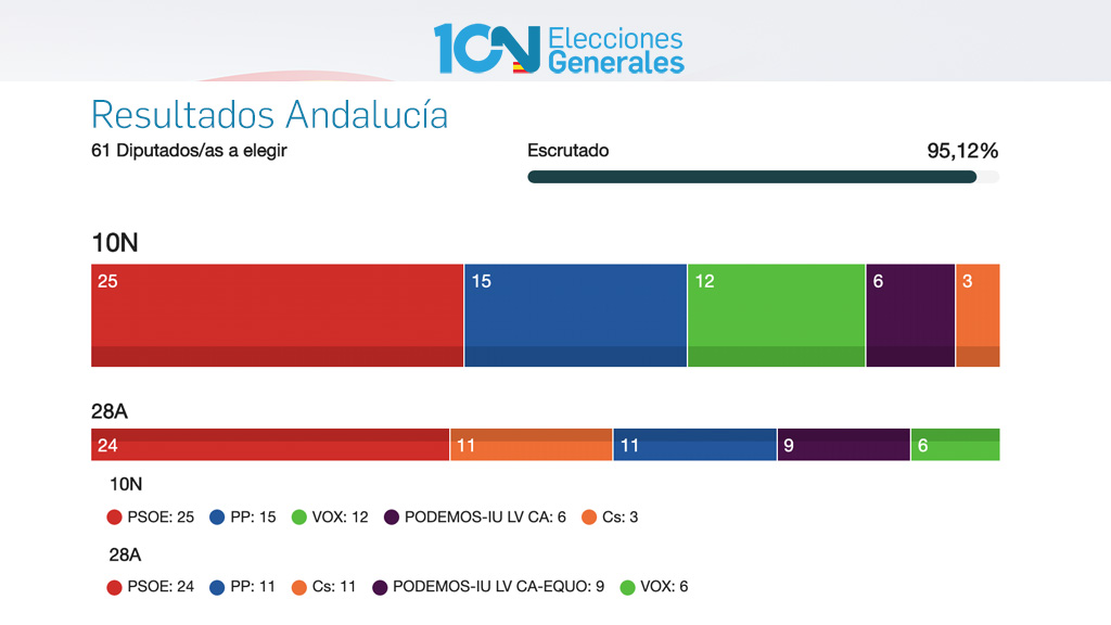 En Andalucía, con el 98,99 por ciento escrutado, el PSOE será también el ganador aumentando sus apoyos y suma un escaño a los resultados de abril, de 24 a 25. La segunda fuerza es el PP con 15 escaños seguido por Vox con 12. Unidas Podemos queda en seis desde los 9 que obtuvo en abril y Ciudadanos cae a tres escaños desde los once de abril.