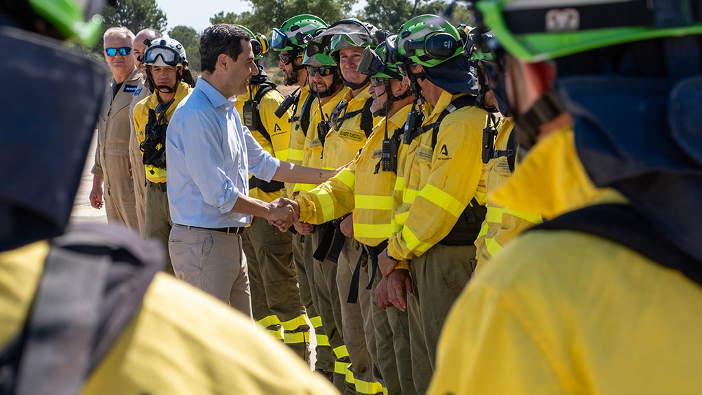 Juanma Moreno recuerda que detrás del 95 % de los incendios está la mano del hombre y que se avecina un verano extremadamente cálido.