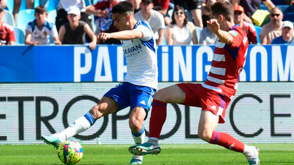 El conjunto aragonés pudo haberse adelantado en el marcador pronto pero Iván Azón, que estrenaba su titularidad después de dos meses lesionado y de haber jugado en la segunda parte del encuentro de la pasada jornada, falló lo que parecía increíble. En el minuto 7, en boca de gol, no consiguió contactar con el balón tras un centro raso de Giuliano Simeone y dos minutos después se repitió prácticamente la historia porque a medio metro de la línea de gol le dio mal al balón y permitió al guardameta Raúl Fernández despejar. Después, el Granada se hizo dueño del balón ante un conjunto maño esperando para salir a la contra con velocidad.