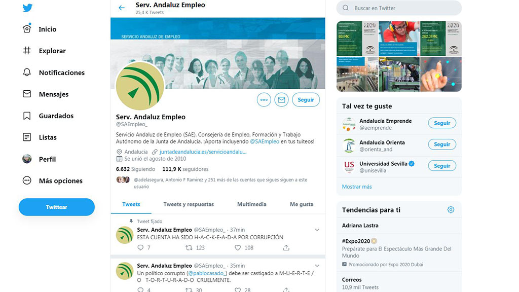 Sobre las tres de la tarde de este miércoles, la cuenta oficial del Servicio Andaluz de Empleo en Twitter ha comenzado a lanzar mensajes contra Pablo Casado al que se señala como un "político corrupto" y debe ser "castigado por ello".