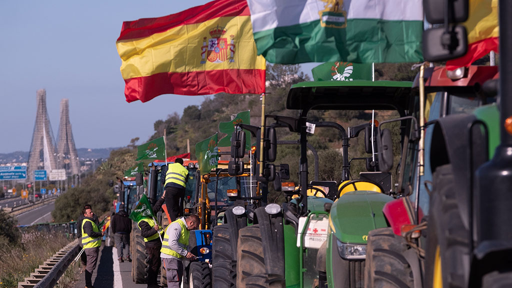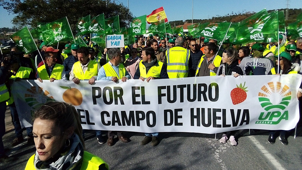 Los agricultores onubenses han cortado durante dos horas y media la A-49 en la frontera con Portugal, cerca del Puente Internacional del Guadiana para pedir "precios justos". El objetivo de hacerlo en ese punto es "internacionalizar el problema" y que el conflicto "llegue a Europa".