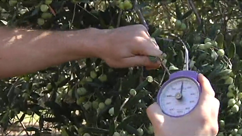 Están recogiendo 12 kilos por cada variedad de aceitunas en fincas seleccionadas en distintos municipios de la provincia onubense. Se comprueba y toman notas de la capacidad de desprendimiento del árbol. Se busca el momento óptimo de la recolección.