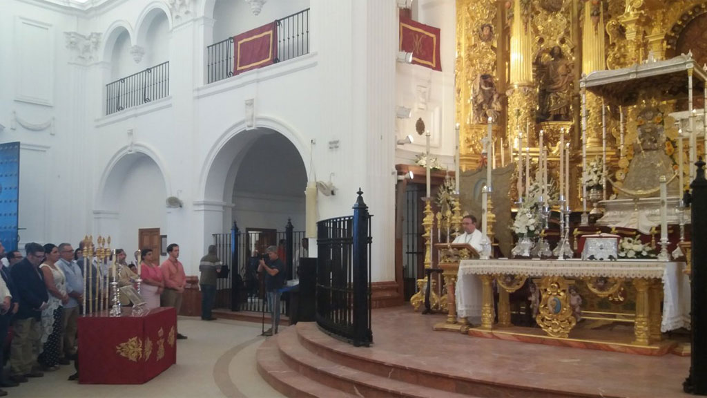 Así lucía este mediodía la virgen del rocío, que recibía un incesante ir y venir de visitas a su ermita en las horas previas al Rocío chico. Aguardando el juramento e imposicion de medallas de los nuevos hermanos y el santo rosario del sábado y el domingo, tras la misa en el santuario, presidida por el arzobispo castrense, la Procesión Eucarística por la aldea.