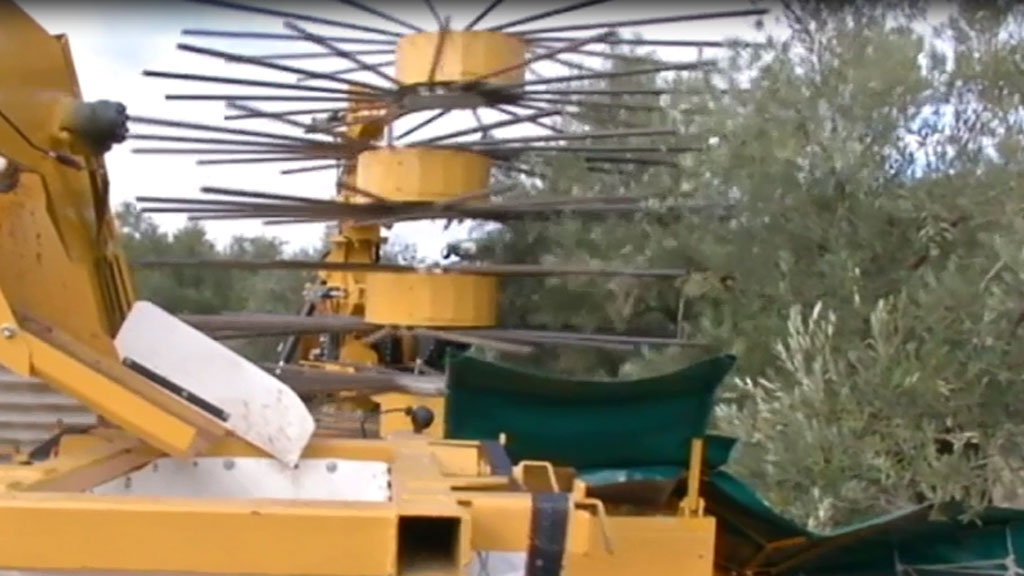 Comprobamos en vídeo cómo esta cosechadora realiza todo el proceso. Vibra y sacude el follaje del olivo, derriba las aceitunas sobre una superficie de recepción y las limpia de ramaje y hojas antes de envasarlas en sacos con destino a la almazara.