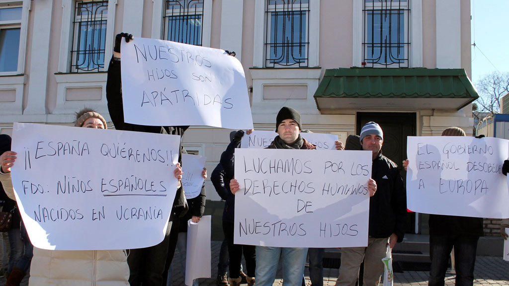 Entre los españoles que están en Ucrania están Reyes y Carlos. Se encuentran allí desde el 7 de diciembre, cuando nació su niña. Por fin han sido citados por el consulado español para inscribir a la pequeña en el consulado. Es un avance importante para esta familia y para otras que llevan peleando por conseguir una salida a su situación. El pasado lunes se concentraron ante la legación diplomática española con pancartas en las que acusaban al Gobierno de España de violar los derechos de sus hijos por obligarles a acogerse a la normativa de 2010 que les condiciona a hacer todo este trámite.
