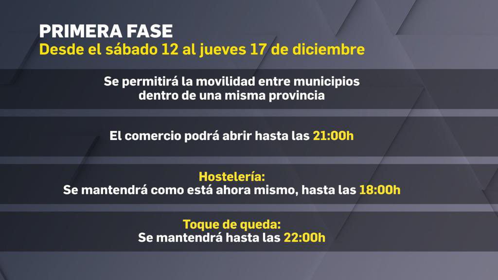 Andalucía permitirá la movilidad dentro de cada una de sus provincias desde la medianoche de este próximo sábado, 12 de diciembre, así como entre municipios de distintas provincias a partir del día 18 de este mes y al menos hasta el 10 de enero. Asimismo, posibilitará la entrada y salida de la comunidad autónoma entre los días 23 de diciembre y 6 de enero, coincidiendo con las fiestas navideñas, si es para permitir reagrupaciones familiares con motivo de esas celebraciones.