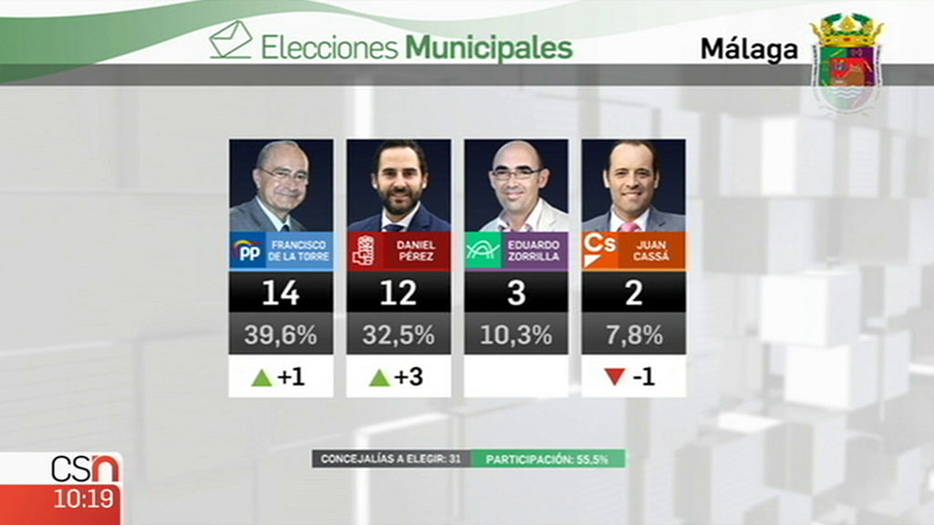 El PP ha conseguido un edil más en Málaga al pasar de 13 a 14, los socialistas de 9 a 12, Ciudadanos pierde uno porque tenía tres y en las anteriores "Málaga para la Gente" (liderada por Izquierda Unida) obtuvo dos y Málaga Ahora (impulsada entonces por Podemos y ya no) logró 4, pero en esta ocasión queda sin representación.