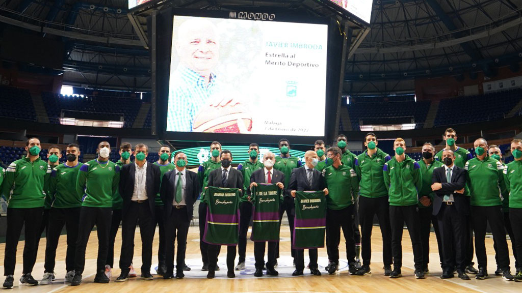 Imbroda ha recibido este viernes en el Estadio José María Martín Carpena de Málaga la estrella al mérito deportivo acompañado del vicepresidente andaluz, Juan Marín, entre otros consejeros, así como del secretario general de Deportes de la Junta, José María Arrabal, del alcalde de Málaga y de la plantilla del club Unicaja Baloncesto.