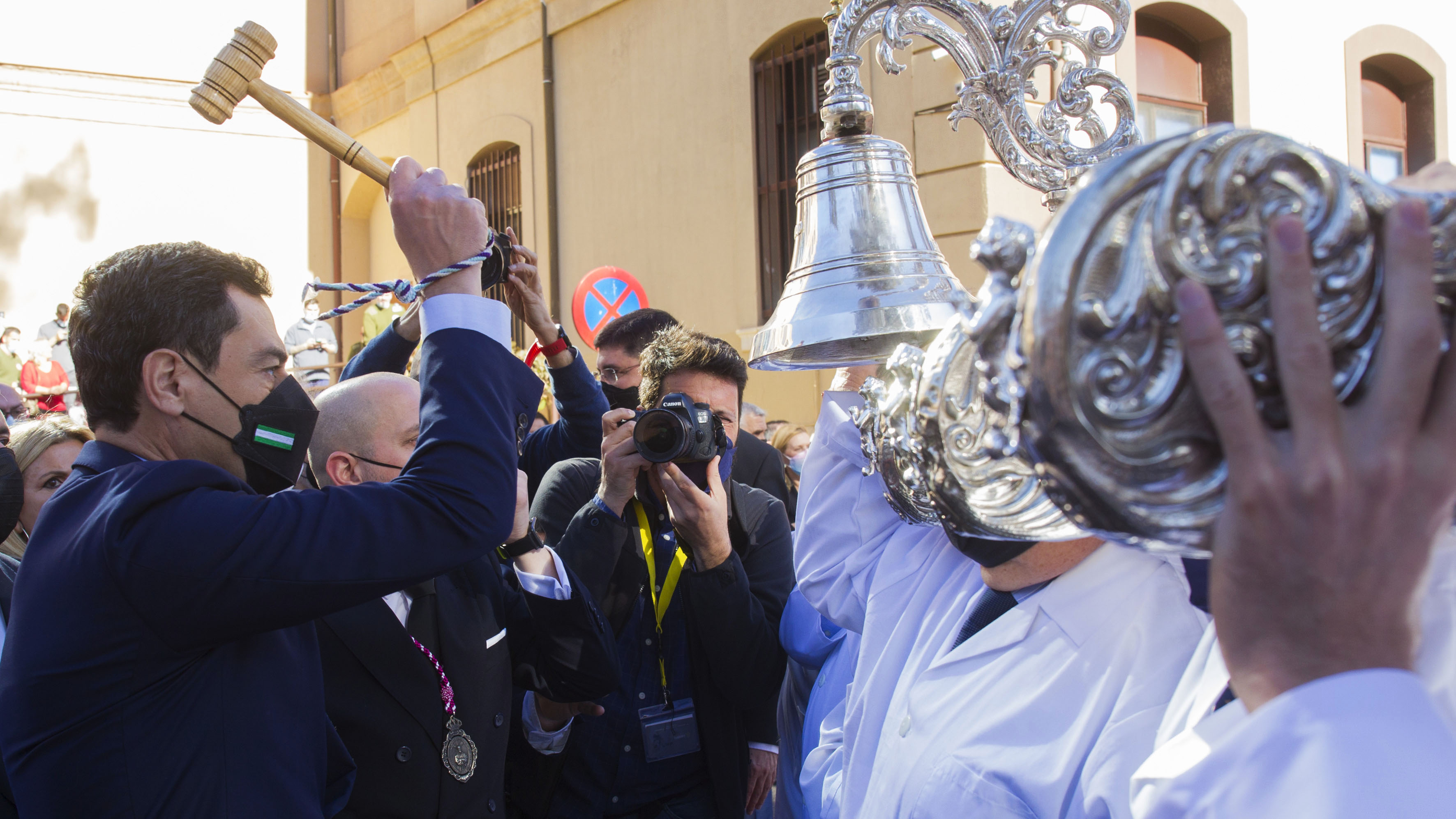 El presidente andaluz, Juanma Moreno, habla en directo con Domi del Postigo en "Días de Andalucía", durante el acto de homenaje a enfermos y sanitarios, en el Hospital Civil de Málaga, de la cofradía del Cautivo. "Necesitamos tener las manos desatadas", ha dicho el gobernante en alusión a la popular imagen malagueña sobre una posible convocatoria electoral en junio sobre la que medita "pensando en los andaluces y en la comunidad".