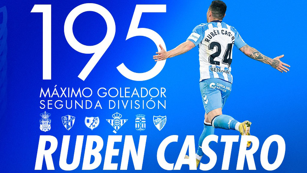 Rubén Castro lo ha conseguido. Tras coronarse en febrero como máximo goleador de la Liga con sus tantos en las dos categorías profesionales del fútbol español, Primera y Segunda, ahora se corona como el mejor artillero de la historia en Segunda división con 195 tantos.