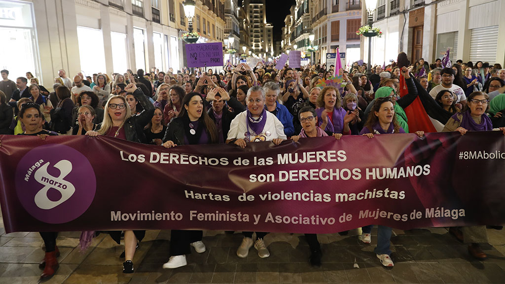 El feminismo malagueño marchó unido por las calles de la ciudad, teñidas de violeta. La marcha concluyó en la Plaza de la Constitución, donde se leyó el manifiesto, que incidió en la lucha por la igualdad real entre hombres y mujeres. Bajo el lema 'Los derechos de la mujer son derechos humanos', la manifestación unitaria, convocada por el movimiento feminista y apoyada también por otros colectivos y los sindicaos UGT y CCOO, la marcha discurrió por las principales calles del centro de Málaga.
