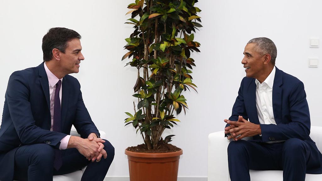 Tras su intervención, Obama mantuvo un breve encuentro con el presidente del Gobierno, Pedro Sánchez, en el que conversaron sobre temas como el futuro de las nuevas generaciones, la igualdad de género y el cambio climático.