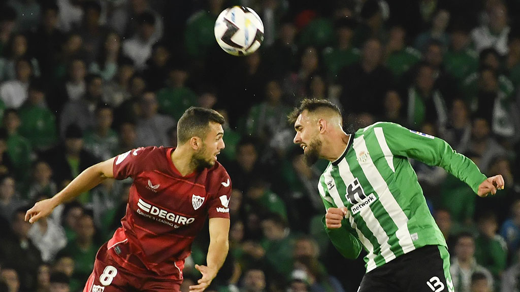 Buscó el Sevilla tocar el balón en el arranque sin crearse demasiadas complicaciones para intentar así que la presumible intensidad del Betis del inicio se fuera apaciguando con el paso de los minutos, pero pronto los de Pellegrini crearon la primera opción de gol, en una falta lateral al área que le hicieron a Nabil Fekir, que sacó el propio francés y que Rafa Mir, en el intento de despeje, estrelló el balón contra un poste de su portería.