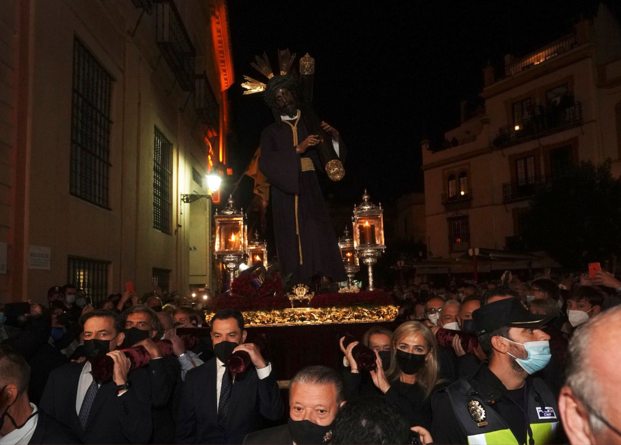 El presidente de la Junta, Juanma Moreno, asistía al traslado. Moreno ha mostrado su respeto ante la imagen del Gran Poder en la sede de la Consejería de Cultura y Patrimonio Histórico, momento en el que además ha realizado una ofrenda floral. Seguidamente, ha portado en andas la imagen del Señor.