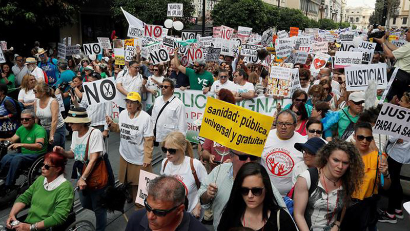 Los manifestantes han recorrido las calles del centro de Sevilla reclamando una sanidad pública, digna y completa. Críticos con la gestión del gobierno de la Junta, exigen más inversión y mejor gestión.