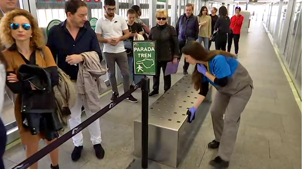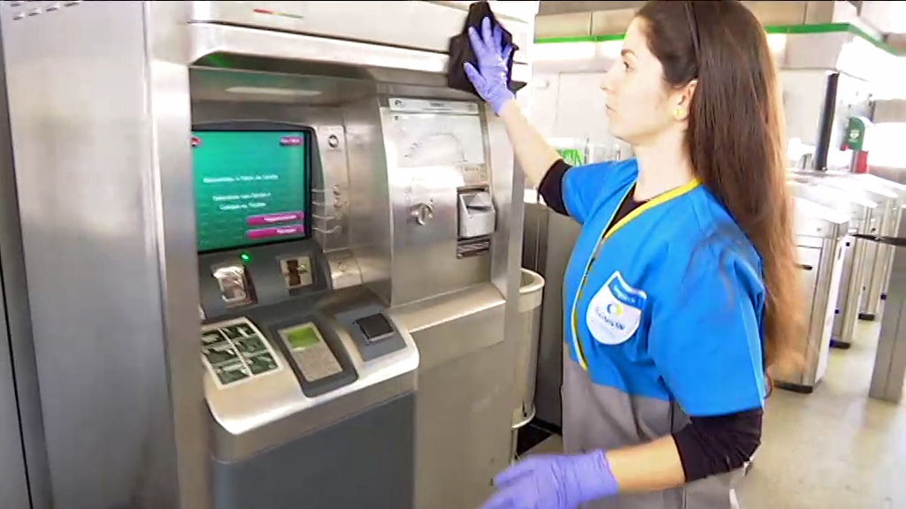 El personal de limpieza realiza esas tareas que se centran en agarraderas, barros, asientos, pulsadores, puertas y máquinas expendedoras de billetes