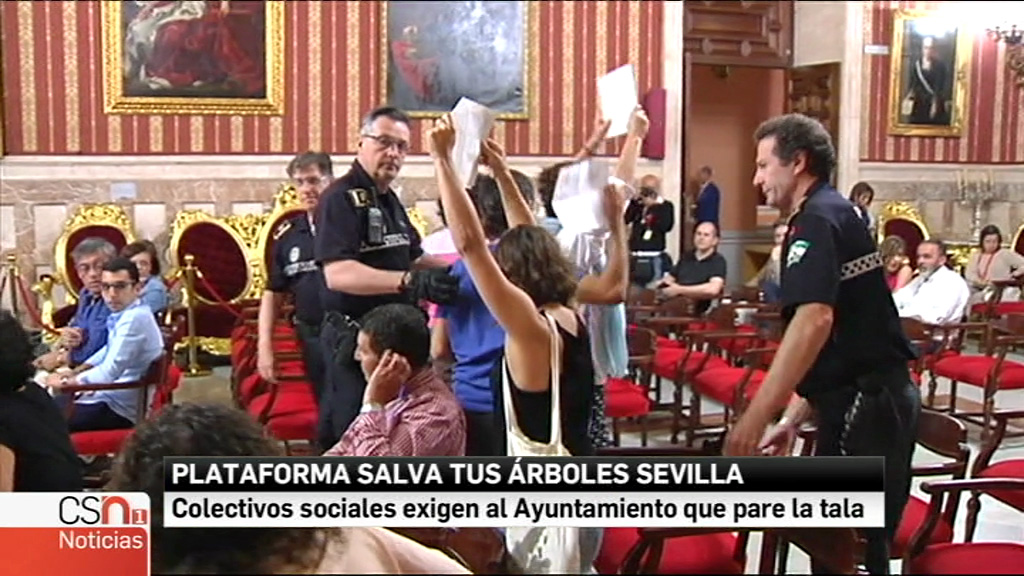 Hoy se han concentrado ante el consistorio y luego varios grupos han interrumpido el pleno extraordinario que se celebraba dentro. Exigen que se pare la tala. El gobierno municipal, por su parte, insiste en que es necesaria para garantizar la seguridad y que se tratan de ejemplares enfermos.