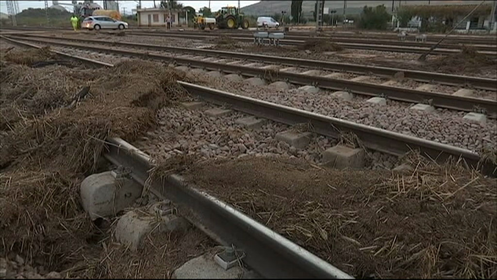 Los gravísimos daños en el terreno donde estaban fijados los raíles no han permitido todavía el acceso de la maquinaria precisa para las reparaciones. Hay tramos en los que, a lo largo de centenares de metros, las vías han quedado suspendidas en el aire.