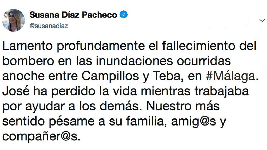 Horas antes, en su cuenta de Twitter, Díaz lamentaba "profundamente" el fallecimiento del bombero. "José ha perdido la vida mientras trabajaba por ayudar a los demás. Nuestro más sentido pésame a su familia, amig@s y compañer@s".