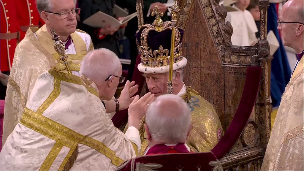 En una ceremonia llena de protocolo y simbolismo, y en la que la música ha ocupado un lugar preferente, el monarca, ataviado con la capa de armiño, ha recibido la Biblia, como jefe de la iglesia anglicana. Posteriormente, tras desvestirse en un panel oculto al público, ha sido ungido con los santos óleos en la cabeza, manos y pecho, con aceite traído de olivos de Jerusalén.