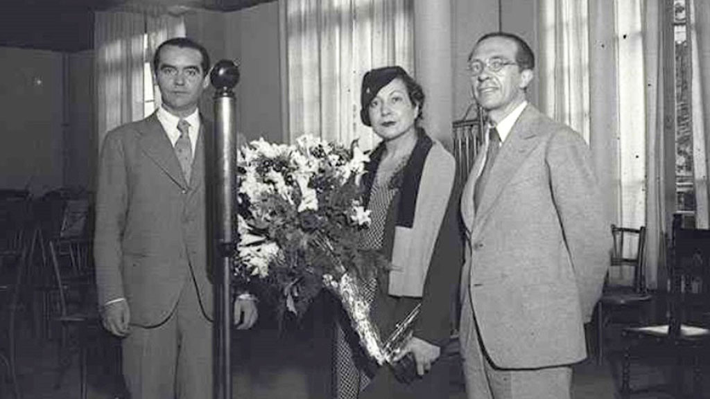 Joaquim Gasca remarca que es una fotografía tomada a principios de octubre de 1935 en la sede de la emisora de radio, con Xirgu sosteniendo un ramo de flores, entre Federico García Lorca y un sonriente Rivas Cherif.