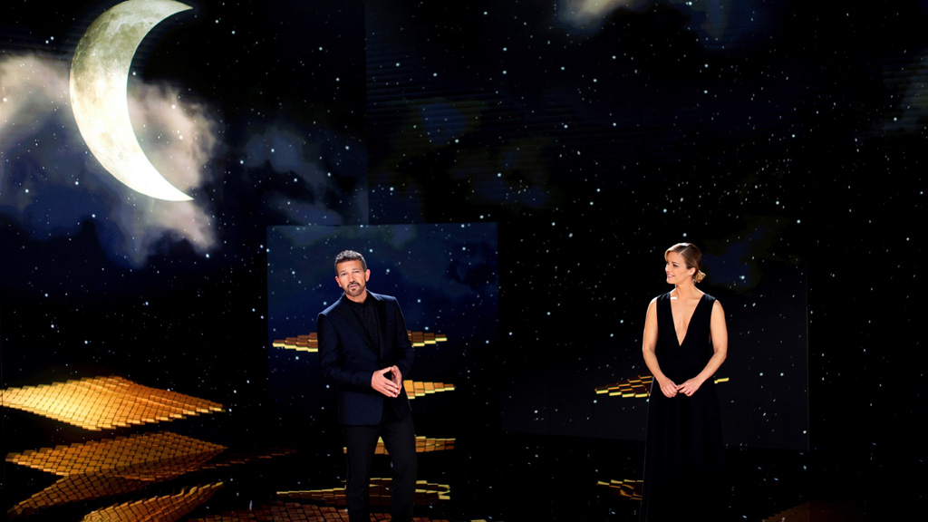 La puesta en escena en el Teatro del Soho no ha dejado tampoco indiferente a nadie, cientos de pantallas arropaban a los conductores de la gala, Antonio Banderas y María Casado. Sobre el escenario se puedo ver todo un despliegue de realidad virtual que consiguió que el teatro malagueño no pareciera estar, como estaba, vacío.