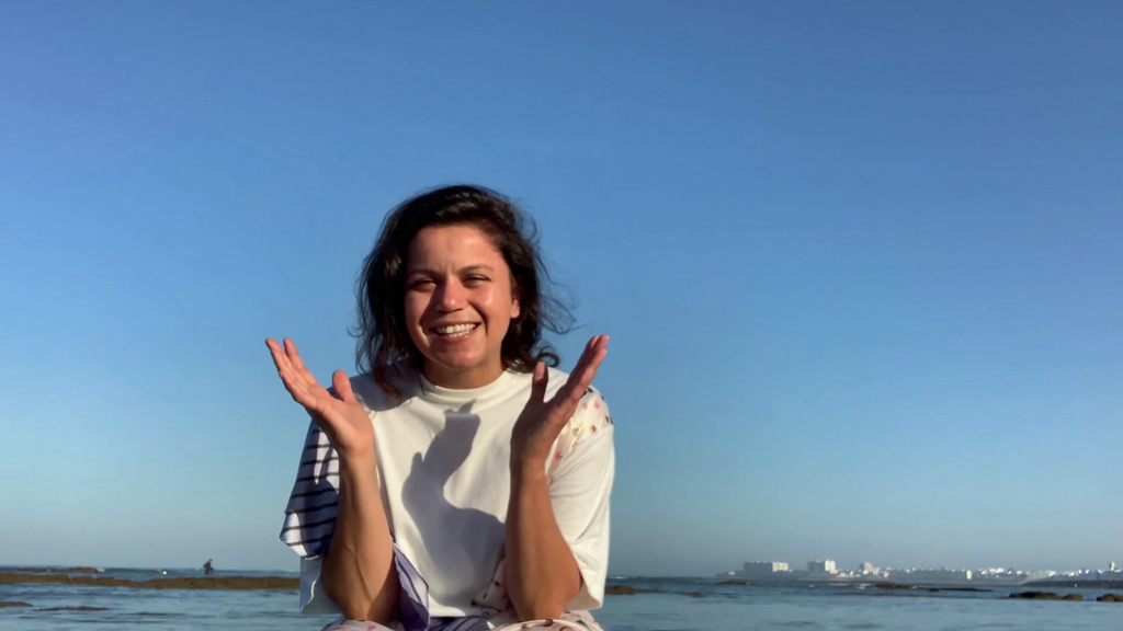 Conectamos y el azul traspasa la pantalla. Un mar y el sonido de sus olas nos acompañan mientras María reflexiona sobre esta Fase de Transición por la que caminan el Arte y la Cultura.