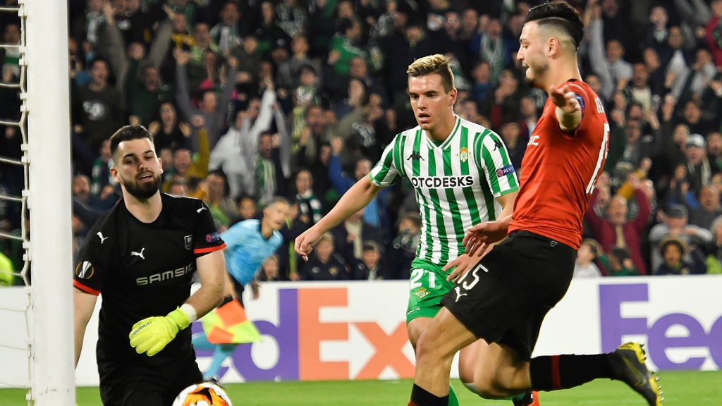 El futbolista del Rennes, libre de marca, marcó de cabeza, un problema para el Betis, que volvió a encajar en una jugada a balón parado, un problema que le llega habitualmente este curso.