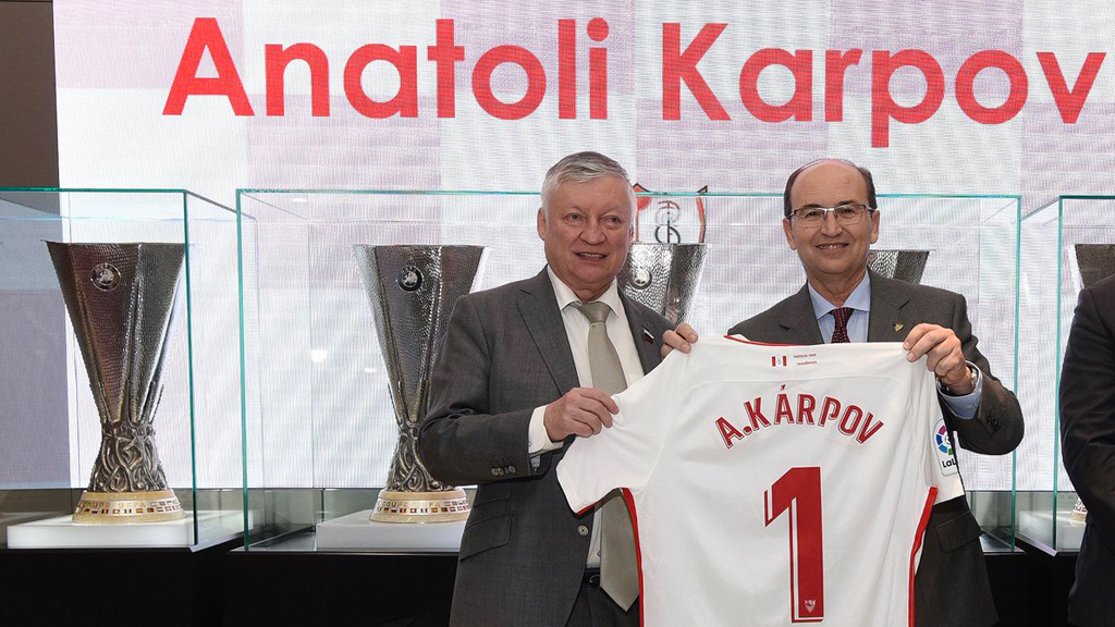 El Museo del Sevilla en el Sánchez Pizjuán ha tenido hoy un visitante ilustre, Anatoli Kárpov. El Sevilla se ha sumado a los reconocimientos al ajedrecista ruso en su vuelta a la ciudad hispañense, 31 años después de disputar el Mundial. Kárpov se ha llevado su camiseta de recuerdo y ha firmado en el libro de honor de la entidad sevillista.