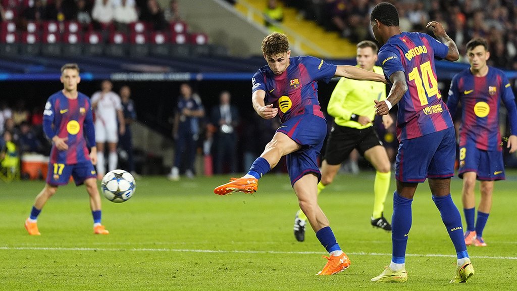 El onubense marca en Champions el primer triplete de su carrera profesional y le regala una goleada al Barça de Hansi Flick en un encuentro que se rompió con la expulsión de Santiago Hezze en el minuto 57.
