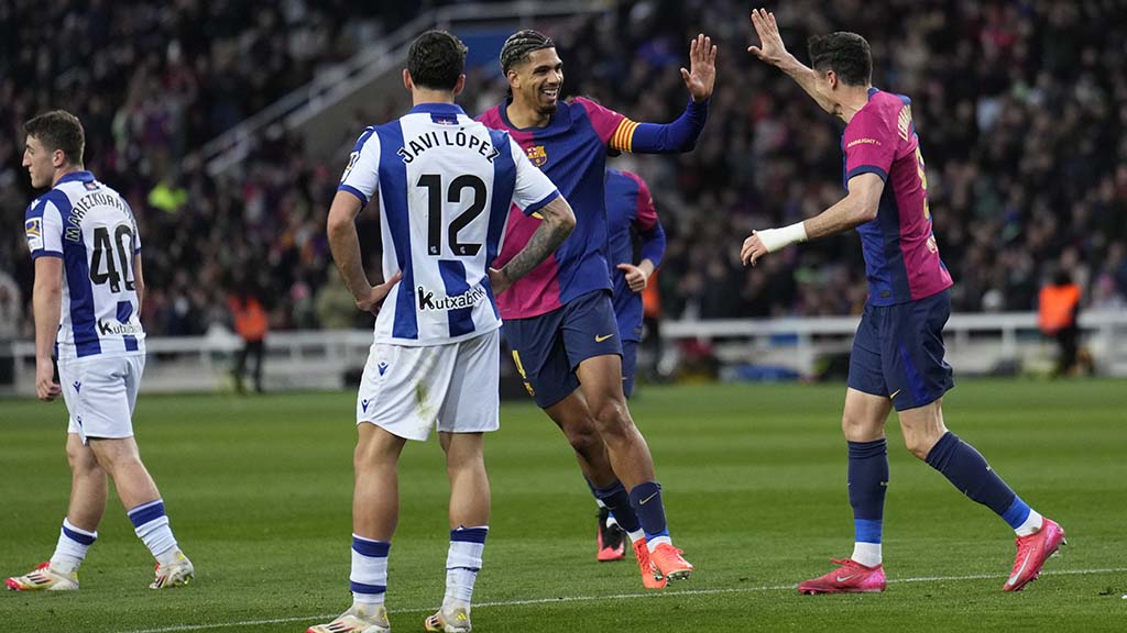 El FC Barcelona se ha situado este domingo como líder en solitario de LaLiga EA Sports después de superar a la Real Sociedad en el Estadi Olímpic Lluís Companys (4-0), un partido en el que la sorprendente expulsión del capitán 'txuri urdin' Aritz Elustondo en el minuto 17 permitió a los de Hansi Flick deshacerse de la presión y firmar una victoria vital.
